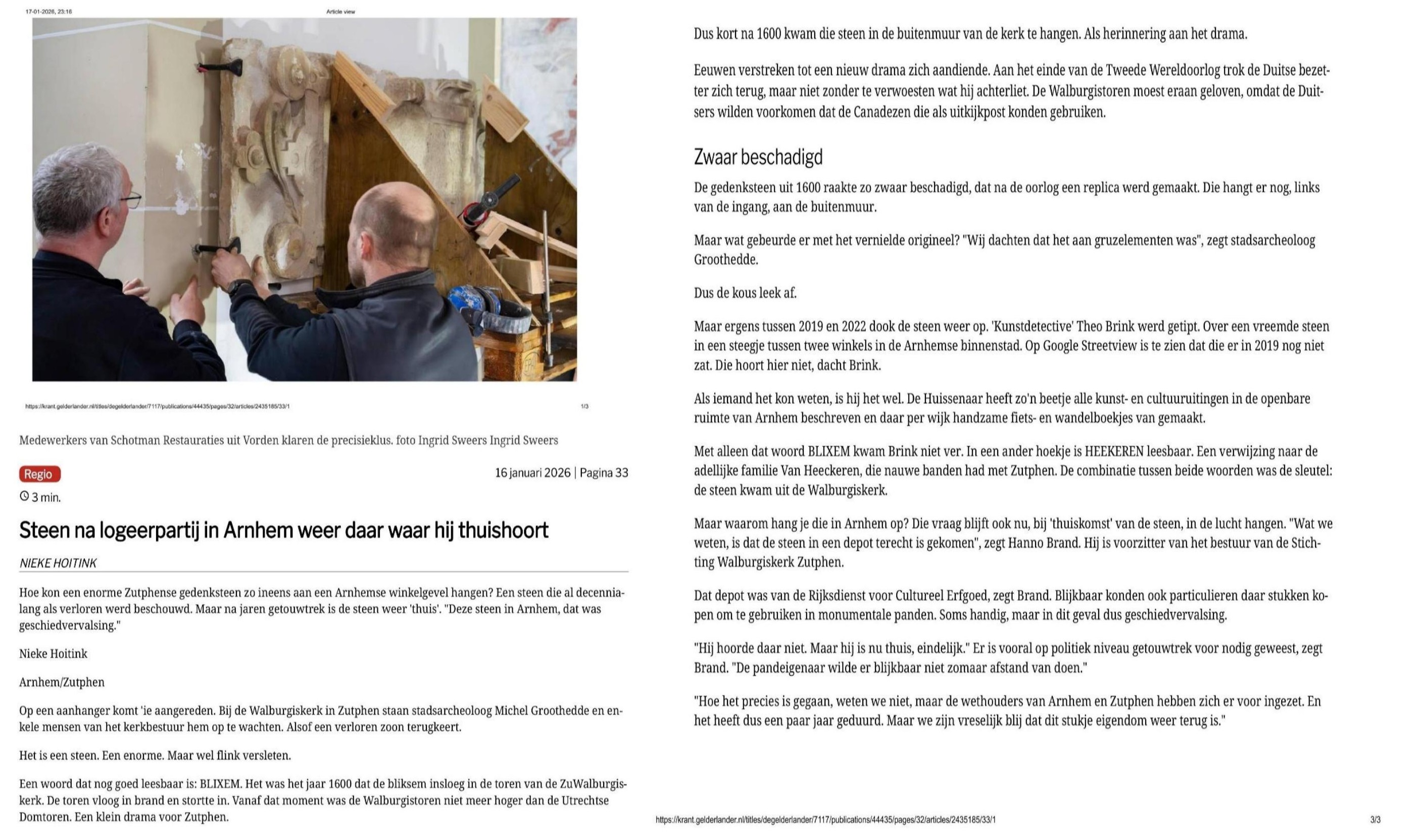 Eind 2021 werd in Arnhem een vreemde in slechte staat verkerende gevelsteen ontdekt. Na uitgebreid zoeken bleek het een 350 jaar oude gevelsteen te zijn uit Zutphen. Na uitgebreid zoeken werd ook ontdekt hoe deze gevelsteen in 2020 in Arnhem terecht was gekomen. Pure geschiedvervalsing. De Stentor en de Gelderlander vonden het in maart 2022 een artikel met foto en filmpje waard. Maar nu is de steen weer terug in Zutphen dankzij de inzet van de Hist. Ver. Zutphen en de gemeente Zutphen. Super. Ook nu weer een leuk artikel in de Gelderlander.