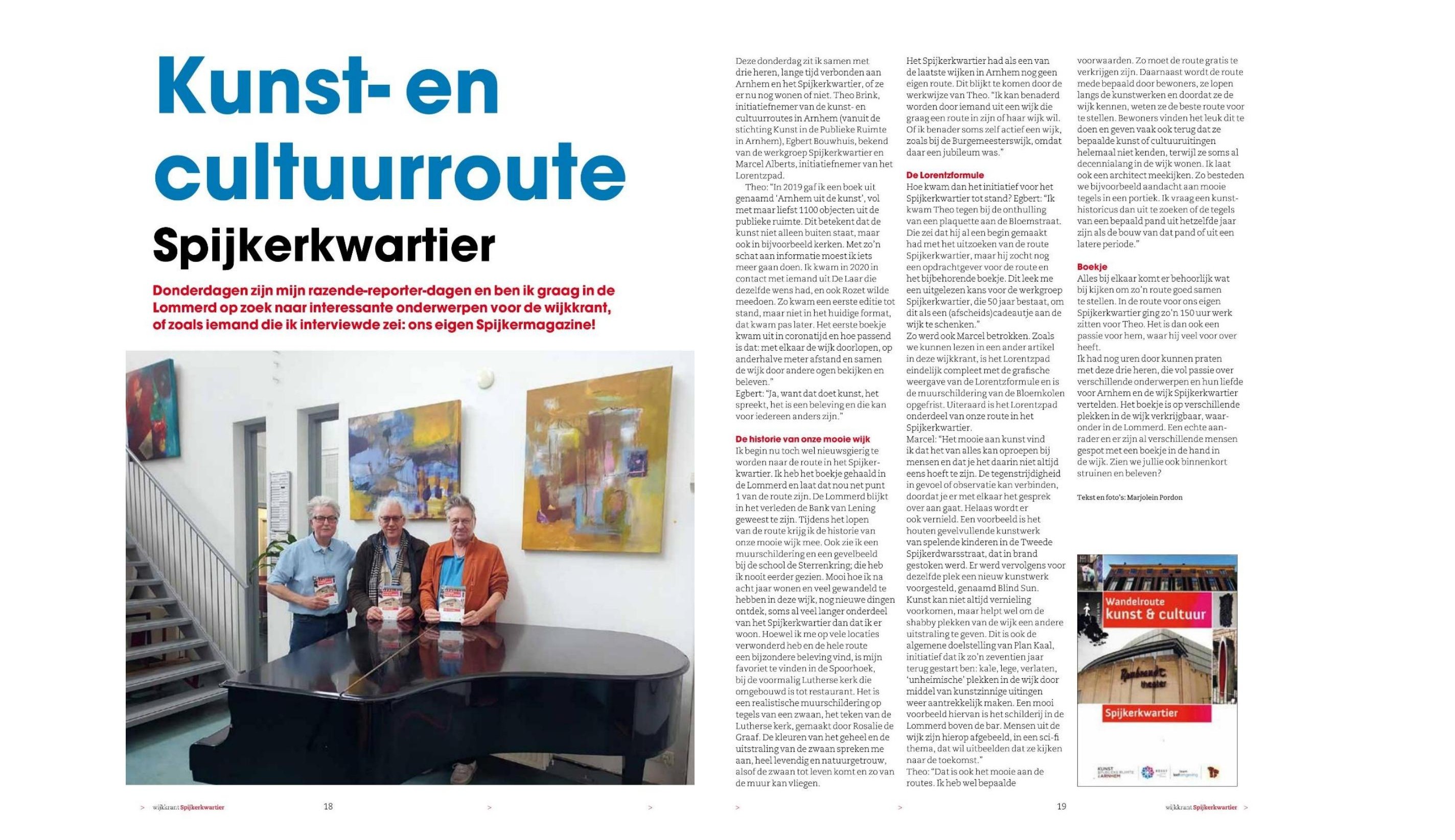 De nieuwe kunst- en cultuurroute Spijkerkwartier kreeg extra aandacht in de wijkkrant Spijkerkwarteir van november j.l. Wijkverslaggeefster Marjolein Pordon wist precies de goede vragen te stellen. Met daarbij een prachtige foto van de drie 'hoofdrolspelers'.